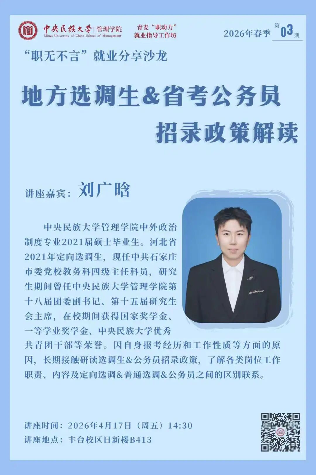 中央民族大学管理学院中外政治制度专业2021届硕士毕业生。河北省2021年定向选调,现任中共石家庄市委党校教务科四级主任科员,研究生期间曾任中央民族大学管理学院第十八届团委副书记、第十五届研究生会主席,在校期间获得国家奖学金、一等学业奖学金、中央民族大学优秀共青团干部等荣誉。因报考经历和工作性质等方面的原因,长期接触研读选调&公务员招录政策,了解各类岗位工作职责、内容及定向选调&普通选调&公务员之间的区别联系。